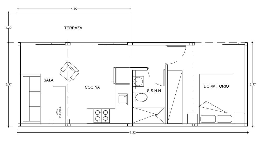 Es uno de los modelos más pequeños de nuestra línea de casas modulares, optimizado para ofrecer todo lo necesario en un espacio reducido: cuenta con 1 dormitorio, 1 baño, sala-comedor, kitchenette, lavandería y la terraza integrada. Una solución inteligente y estilizada para quienes valoran lo esencial sin renunciar al confort.