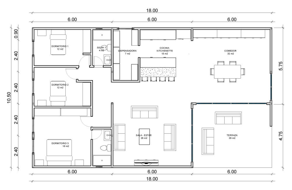 Descubre nuestra moderna casa modular de mayor escala, perfecta para familias grandes. El modelo Valencia destaca por su diseño amplio y eficiente, ofreciendo 3 dormitorios, 2 baños, sala-comedor, una kitchenette y una encantadora terraza.